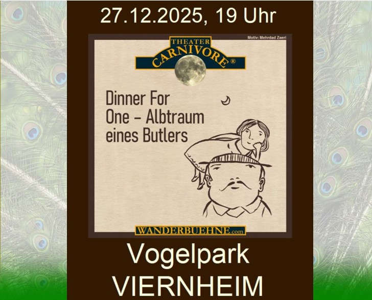 Der Silvesterklassiker aus der Vogelperspektive 🙂 Am 27.12.2025 spielen wir um 19 Uhr (Einlass 18 Uhr) „Dinner for One – Albtraum eines Butlers“ im Vogelpark Viernheim. Freilicht/Open Air!